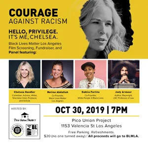 Join White People 4 Black Lives and the Pico Union Project for a special;Courage Against Racism event screening of Chelsea Handler’s new Netflix documentary “Hello Privilege. It’s Me, Chelsea.” The film will be followed by a panel discussion with Chelsea and organizers Melina Abdullah (co-founder, Black Lives Matter Los Angeles), Dahlia Ferlito (co-founder, White People 4 Black Lives) and moderated by Jody Armour (Author, Playwright, USC Law Professor.