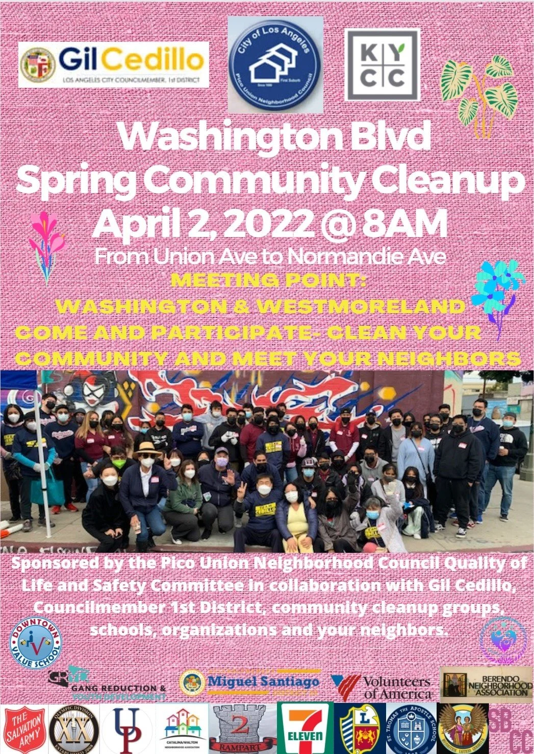 Washington Boulevard Spring Community Clean Up Saturday, April 2, 2022 8:00 AM 12:00 PM Pico-Union 1500 West Washington Boulevard Los Angeles, CA, 90007 United States (map) Google Calendar ICS Sponsored by the Pico Union Neighborhood Council, Quality of Life and Safety Committee in collaboration with Gil Cedillo, Councilmember 1st District, community cleanup groups, schools and your neighbors.